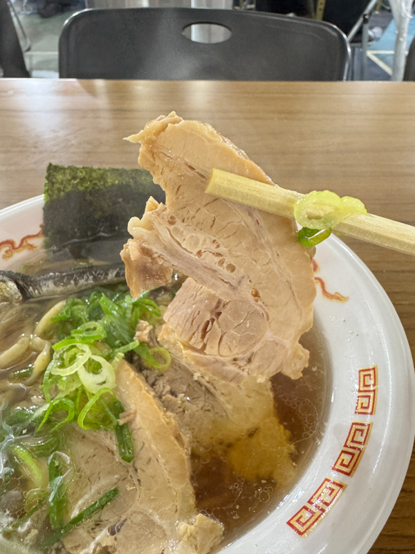 A medium-thick slice of chashu accompanies the bowl. The cut blends lean meat with faint traces of fat, resulting in a texture that’s firm and somewhat dry, yet still flavourful. It disintegrates easily when bitten, leaving behind a deep savouriness and a faintly sour undertone reminiscent of old-school braised pork. It has character but feels slightly dated, out of sync with the modern clarity of the dashi base.
