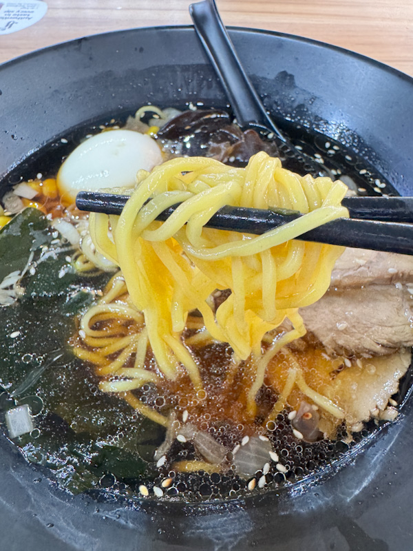 The noodles arrive as medium thin, rounded strands with a bright yellow hue. They land a touch soft, missing that crisp spring one hopes for in a shoyu bowl. The chew is present but not assertive. Flavour-wise, the wheat notes are faint and the strands act more as a vessel to hold the broth rather than a character of their own. They soak up the shoyu cleanly and, fortunately, the alkaline edge stays restrained. Still, the noodles do little to lift the entire bowl and feel more functional than inspiring.