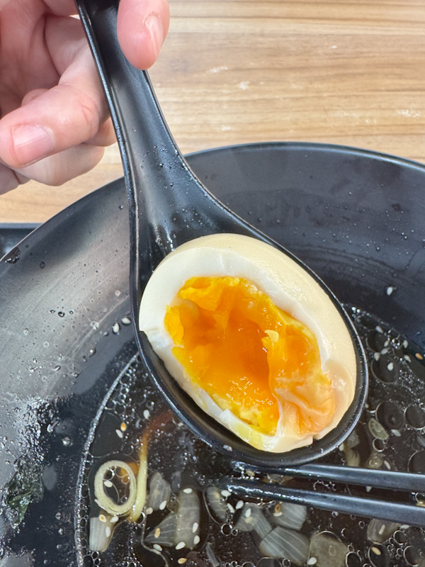 • The marinated egg lands with the correct texture but the marinade sits just a little too thin, offering aroma without full depth.