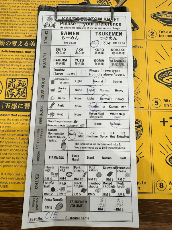 Kanbe Ramen is one of those Kuala Lumpur ramen shops that people are willing to line up for, especially around its original outlet in 163 Retail Park, Mont Kiara, and now at its newer branch by TRX City Park.  Brought in and run by Japanese chefs, Kanbe leans into a very specific niche: Hakata-style tonkotsu ramen and tsukemen, with a menu built around customisation. You pick not just your style of noodle, but also how firm you want them, how intense you prefer the broth, and even the amount of oil and aromatics – a level of control that has made it popular with both local regulars and Japanese expats in KL.