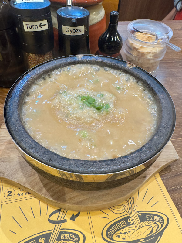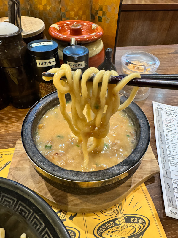 This Shiro dipping broth leans into richness from the moment it hits the palate. The opening notes are creamy and thick, almost enveloping. The mid palate settles into a balanced mix of savoury and sweet with a softness that builds gradually. The finish has a faint lingering heat which I suspect would be more uplifting if I had gone for level one up in spiciness. It is layered enough to stay interesting, yet the sweetness and density can start to feel a touch heavy after repeated dips, especially toward the final stretch of the bowl.