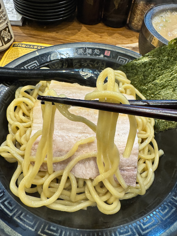 The noodles arrive thick, round and a gentle pastel yellow, carrying that unmistakable tsukemen heft. I opted for the hot version which gives you a firm, chewy bite with a mild mochi mochi quality. The wheat character comes through cleanly with a soft earthiness and a rounded, almost honeyed sweetness. In hindsight, the cold option might have offered a tighter spring and clearer snap, but even served hot, the texture holds its own well.