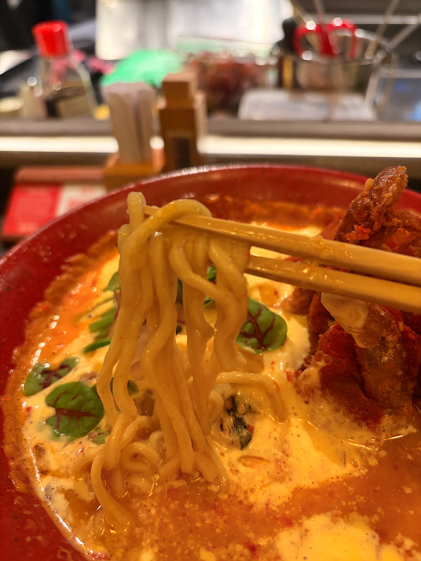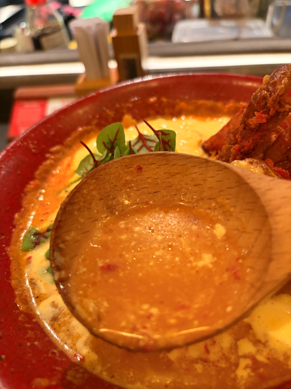 There are two proteins here, chicken chashu and soft shell crab. The chicken slice is firm and springy while remaining tender enough to chew comfortably. Its natural sweetness and umami manage to cut through the spice, offering moments of relief and a mildly addictive savoury note. The soft shell crab arrives crispy in theory but is already half soggy by the time it reaches the bowl. Portions not submerged in soup retain some crunch, suggesting it would have benefited from being served separately. The vibrant red batter is visually striking but largely superficial. Flavour-wise, the crab tastes like crab, though its delicacy is largely overwhelmed by the spice. It looks impressive but does little to elevate the eating experience.