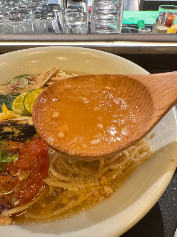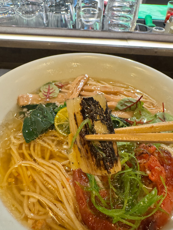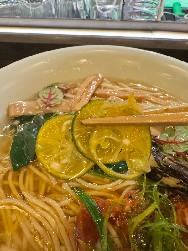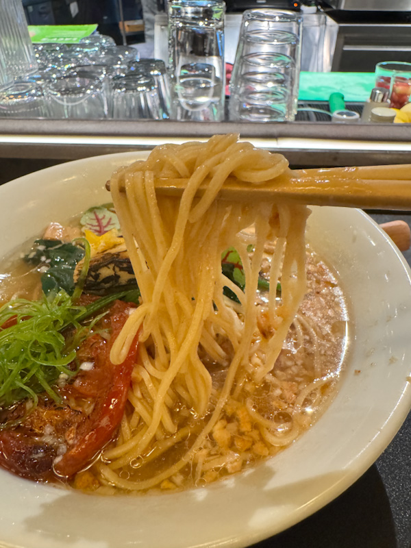 The noodles are medium-thin and straight, cooked al dente with a snappy, firm bite that holds up well through the meal. Mouthfeel is clean and precise, with a satisfying resistance that avoids any soggy collapse. Flavour-wise, there is a subtle, rounded wheat taste with no alkaline sharpness, which works well given the citrus-led soup. The noodle absorbs the fruity sourness nicely, carrying hints of yuzu into each bite. Technically sound and pleasant to eat, though it ultimately lacks a strong individual character and functions more as a capable conduit than a statement noodle.
