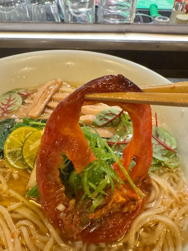 As a vegan bowl, the protein comes in the form of a tomato chashu, essentially a thin slice of tomato with light aburi marks on one side. The cut is thin, and the texture is soft and tender, barely holding its shape. There is a pleasant sourness and gentle fruity sweetness, which makes it enjoyable in isolation. However, as a hero topping, it lacks the savoury weight and textural presence needed to anchor the bowl. It reads more as an accent than a centrepiece, and does not fully justify its role as the primary protein.