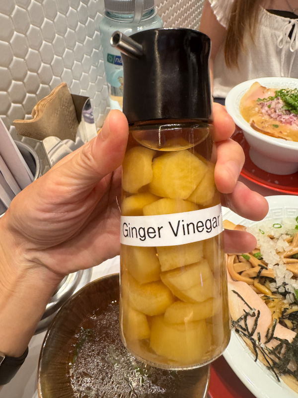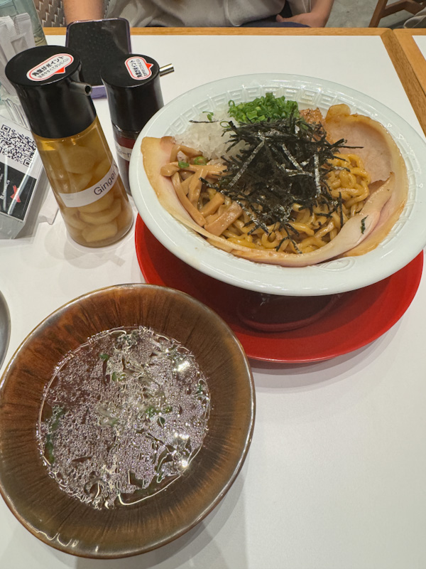 Mazemen lives or dies by its sauce, and this bowl comes equipped with a trio: a sticky umami-rich base, a ginger vinegar for balance, and chilli oil left to personal discretion. A clear side soup rounds out the set.