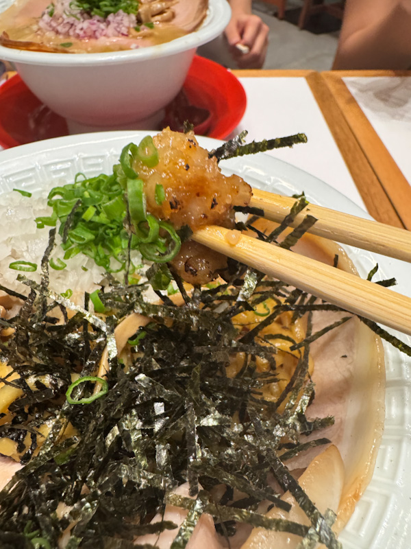 The supporting cast is varied and thoughtful. Pickled mushrooms add crunch and a subtle tang, while seaweed contributes a briny umami that deepens the dish. Negi is fresh and bright, though the onions lacked the sharp piquancy to cut through the richness. Most intriguing was a small scoop of what seemed like rendered fat—mysterious in form but effective in adding body and a touch of decadence without greasiness. Together, these toppings complete the bowl, each playing a distinct role.
