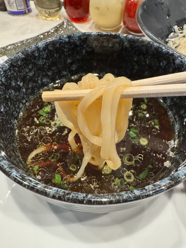 The noodles are a thick, squarish cut with an impressive structural profile. The texture is characterized by a firm, chewy core and a distinct mochi-mochi elasticity. Because they are served in kelp water, the mouthfeel is notably slippery, almost slimy, which acts as a delivery mechanism for the grain. While the wheat taste is prominent, there is a subtle, flat bitterness that persists.