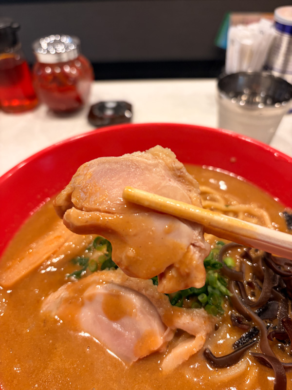 The protein consists of a medium-thick slice of rolled chashu. The texture is firm and decidedly chewy, sitting in a middle ground where it is not dry, yet has not quite achieved a succulent juiciness. To counter the intensity of the shrimp-heavy broth, the kitchen has opted for a strong marination. The flavor is savory with a noticeably sweet body, a deliberate choice that provides a necessary counterpoint to the saline soup, though the meat itself lacks the melt-in-the-mouth quality found in top-tier preparations. The accompanying ebi is a standard shrimp, functional but lacking a distinct culinary signature.