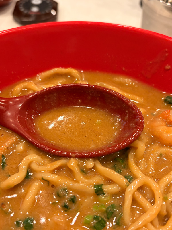 Yoshinori’s Ebi Miso Ramen is a compelling option for those who prioritize a bold, singular flavor narrative. The transition from a quiet seafood start to a powerful prawn finish shows a sophisticated understanding of layering. While the chashu and the textural grit of the broth leave room for technical improvement, the interplay between the mochi-mochi noodles and the brine-forward soup makes this a worthy entry. It is a bowl for the diner who appreciates a gritty, honest expression of the sea.