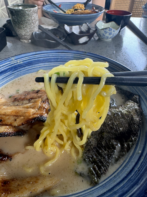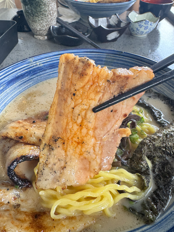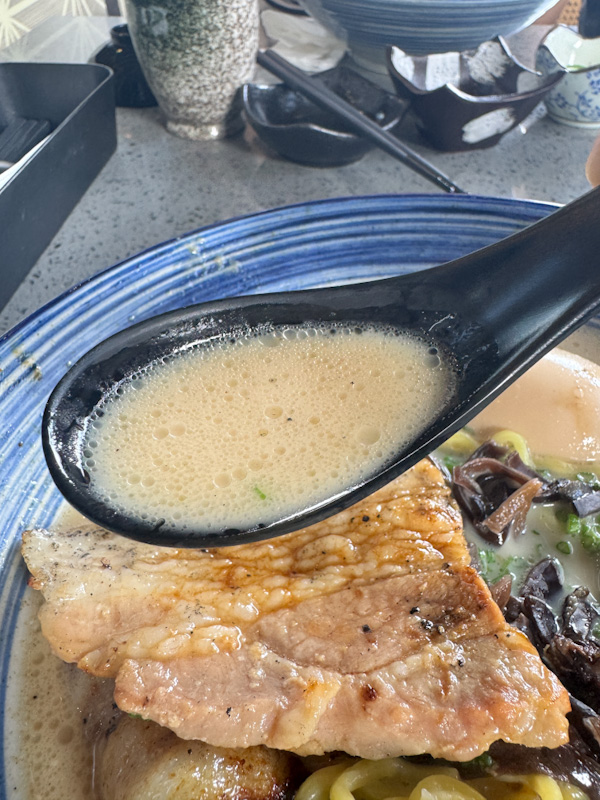 The first sip carries a light milky aroma and faint smokiness—likely from the aburi pork melting into the broth. There’s a trace of umami from the seaweed and a mild sweetness that attempts to round out the savouriness, but the overall impression remains thin.