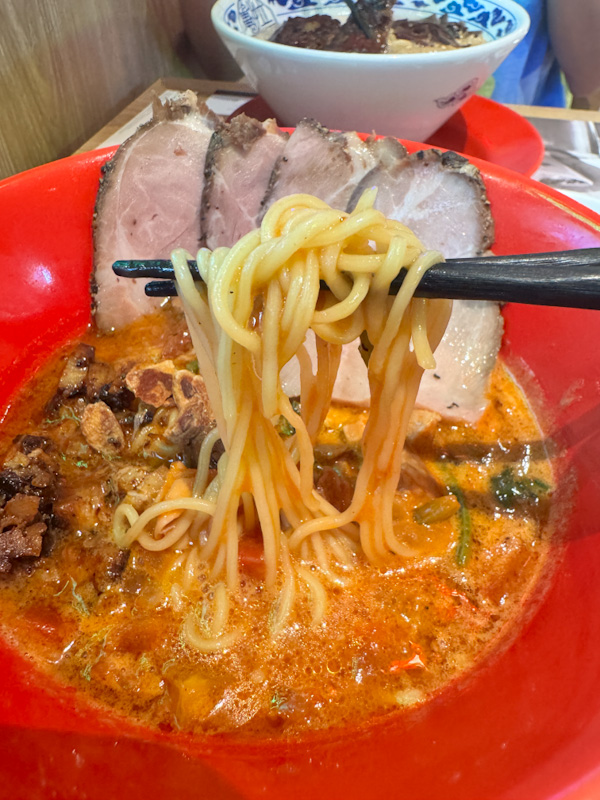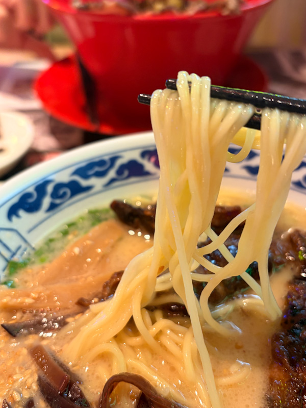 The noodles served here are the same as in their other dishes. The noodles here are described as freshly made Kyushu-style, offering a slight departure from the thinner and firmer Hakata-style noodles commonly found in the region. These noodles are slightly thicker and more springy, providing a satisfying texture. However, I believe there is room for improvement in terms of the mouthfeel and aroma of the noodles.