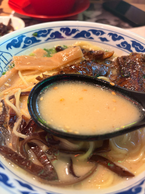 While the broth is undeniably rich, it lacks a truly silky smooth texture, leaning instead toward a more rustic and substantial mouthfeel. The prominent shoyu presence provides a disciplined structure, ensuring the fat content does not become cloying.