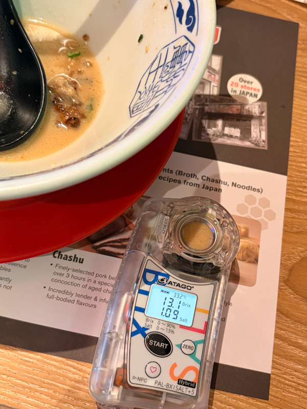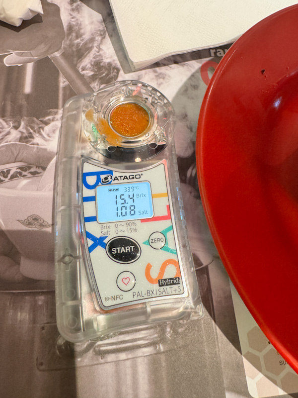 Although the refractometer shows a rather normal salt reading, the soup tasted like a highly concentrated salty broth that is stronger in concept than in its final execution. The initial contact offers a thick richness with a solid, savoury start that promises depth. There is a rounded sweetness detectable amidst the highly saline body, though the structural nuances feel somewhat compressed. The finish is where the balance falters. A fleeting fruitiness from the tomato attempts to emerge but is ultimately overwhelmed by the pungent aroma of fried shallots that have seeped too deeply into the liquid.