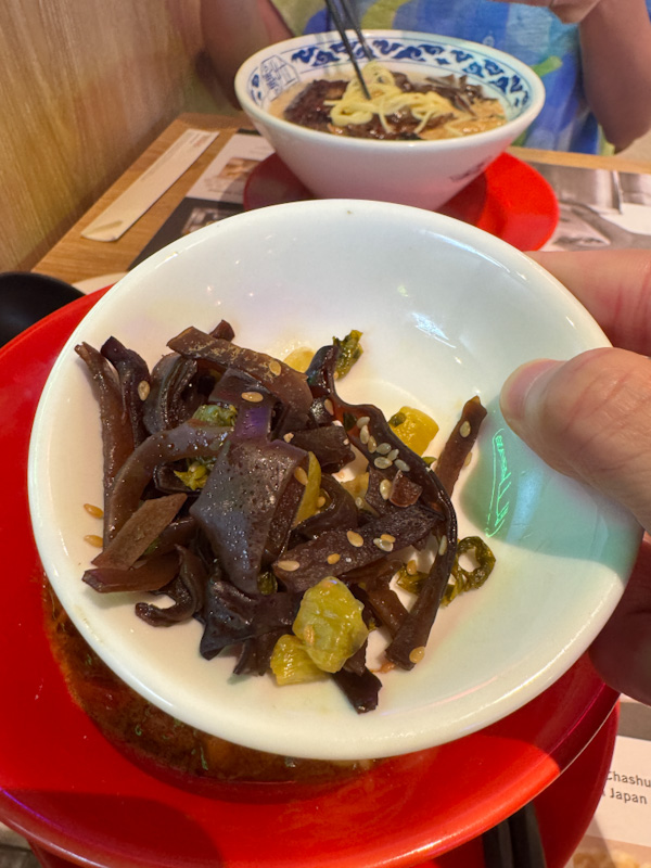 - Side Dish: A small plate of spicy pickles and black fungus is provided. These are appetising and serve as an effective tool for ajihen (flavour transformation) without becoming overbearing.