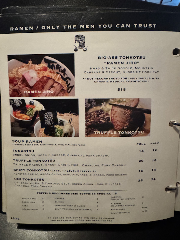 This is a structurally sound bowl with strong technical execution on noodles and toppings. The concept of translating pork bak chor mee into a dry ramen format is clear and mostly successful. However, the sauce calibration limits its ceiling. The initial spice overshadows complexity, and by the second half of the meal, once your palate has adjusted, the flavour becomes more monotonous. The cumulative heaviness of lard and savoury sauce compresses the spectrum, making successive bites taste increasingly similar.