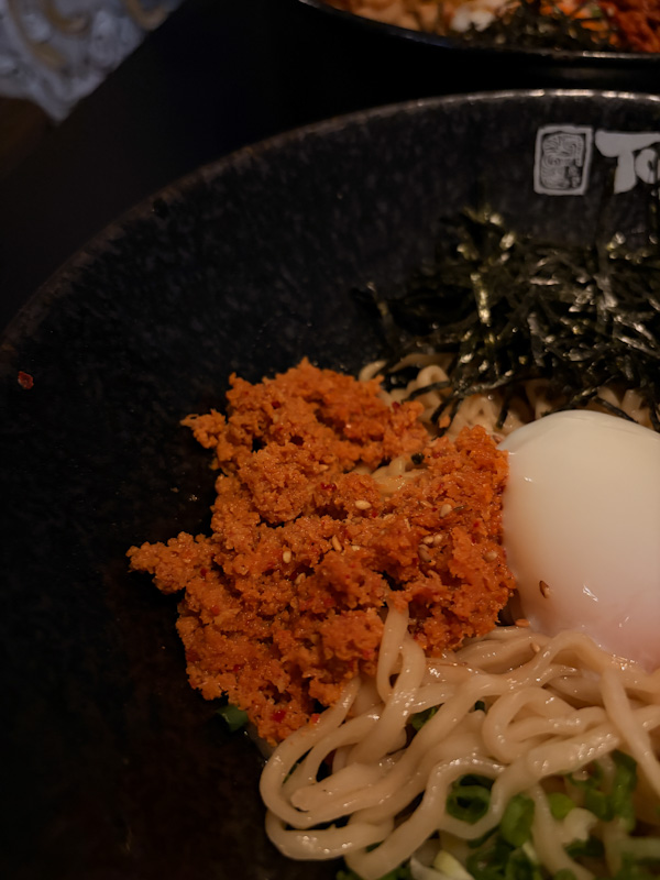- The onsen egg is a critical component. Once mixed in, it emulsifies the sauce, creating a creamier and more cohesive coating around the noodles. The yolk adds viscosity and a gentle sweetness, tempering the sharper spice.