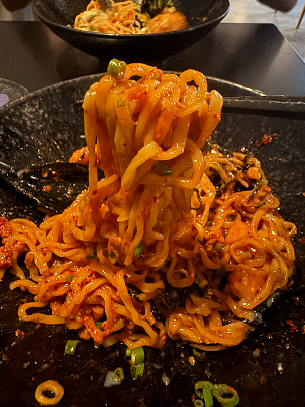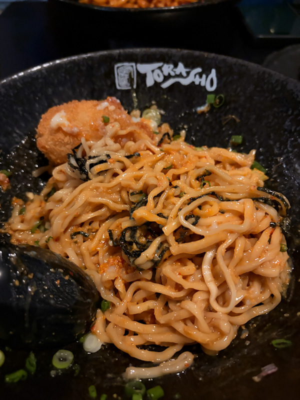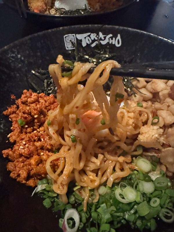 Since this is a dry ramen, the sauce is the engine of the bowl. The first impression is assertive savouriness that quickly transitions into a sharp spicy kick. The spice announces itself loudly. It has a forward heat that borders on aggressive, and in the opening bites it masks the subtler aromatics underneath.