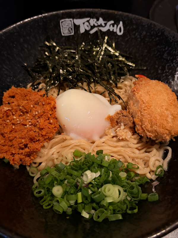 - The onsen egg is essential here. Once mixed in, it creates a creamy and slightly sticky coating that improves mouthfeel dramatically. Without it, the bowl would feel even flatter.